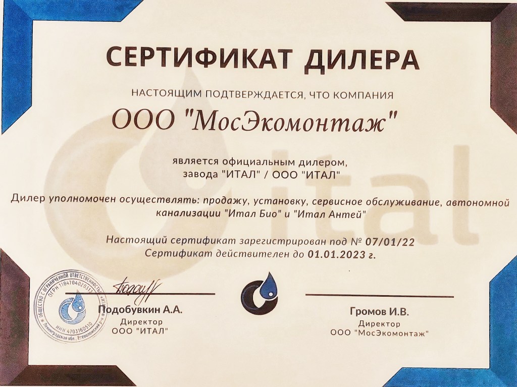 Для загородных домов и дач станции ИТАЛ производятся в двух моделях Био — 10 модификаций и Антей — 4 модификации. Инженерно-монтажная организация МосЭкомонтаж является официальным дилером завода производителя локальных очистных сооружений ИТАЛ для частных домов и дач.